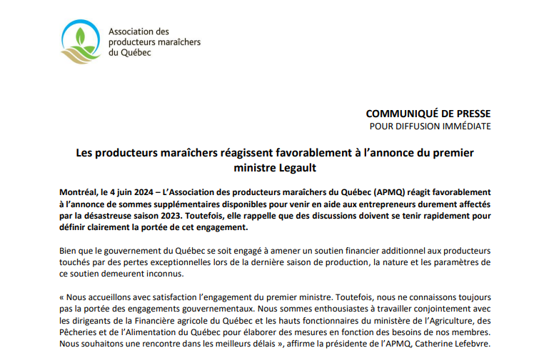 4 juin 2024 Communiqué de presse Les producteurs maraîchers réagissent favorablement à l’annonce du premier ministre Legault Ouvrir
